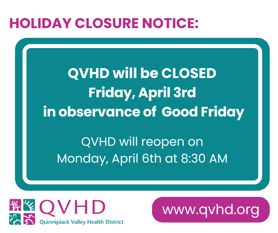 Please be advised, the Quinnipiack Valley Health District (QVHD) will be CLOSED on Monday, February 16th in observance of President’s Day.